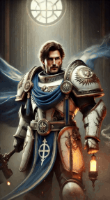 He is wearing an enruned silver-chained relic inlaid with scale-cut topaz, an alabaster shield symbol framed in brilliant white ora, a royal blue longcloak clasped with a star-of-Tamzyrr diamond, a radiant golden crown symbol bedizened with white opal drakes, some dusty brown leather saddlebags slung over your shoulder, a worn leather messenger satchel, a suit of white ora field plate with a pauldron-affixed iron grey linen gambeson tightened across the chest underneath, a pure silver signet ring with a Phoen's eye topaz intaglio, a sable cordovan belt harness with a fir-handled eonake war hammer hanging from it, a rolaren censer etched with an elaborate sunburst symbol, a dark cordovan case whipstitched with rawhide laces, an archaic urglaes reliquary, a pair of brushed silver spurs, and a pair of whiskey brown oilskin riding boots edged with gold.