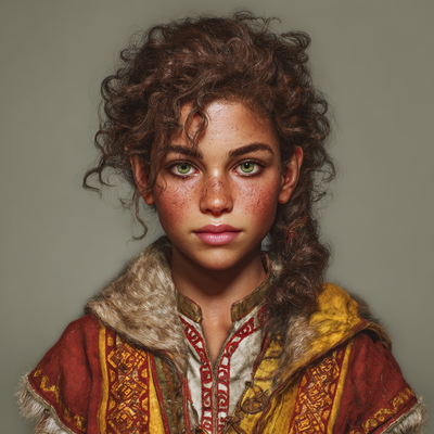 She is short and has a lithe form.  She appears to be very young.  She has lash-framed leaf green eyes and freckle-dusted, golden brown skin.  She has shoulder-length, ringleted ginger hair worn in twisted, frizzy coils.  She has a soft and round face, a small and flat nose and a long jaw with a rounded and slightly pointy chin.