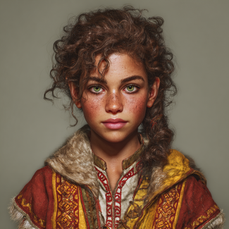 |[[File:Kharru_generated_by_Midjourney.png|400px|thumb|left|Young halfling woman w. freckles and brown, curly hair.]] |